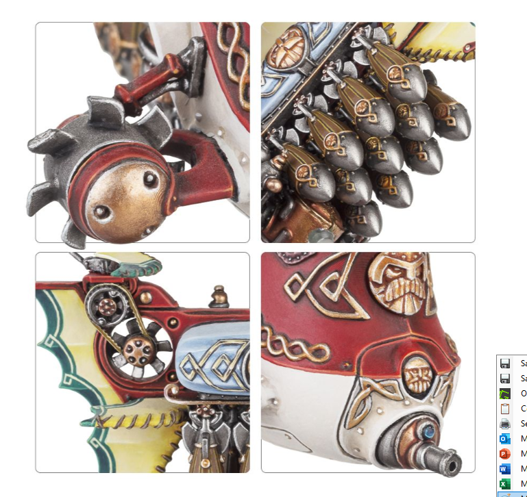 The sleek, heavily armoured Gyrobomber is the next evolutionary step in duardin aerial technology. Kept afloat by two rotor arrays and a dirigible balloon, the Gyrobomber is part Gyrocopter and part airship. Equipped with a formidable payload of eleven grudgebuster bombs and a nose mounted clattergun this miniature is a fantastic collector’s piece.