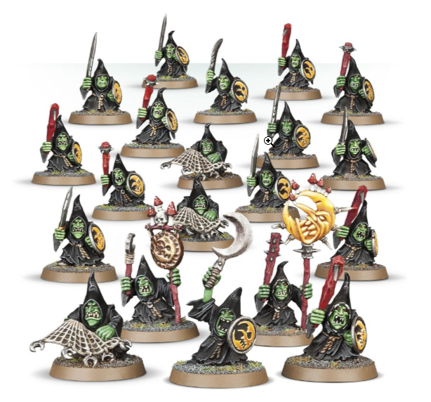 Moonclan Stabbas form ragged ranks that advance upon the foe with gongs clanging and banners waving. Eyes bulging with the madness of the Gloomspite, they pour over the enemy lines and stab wildly at everything in their path.