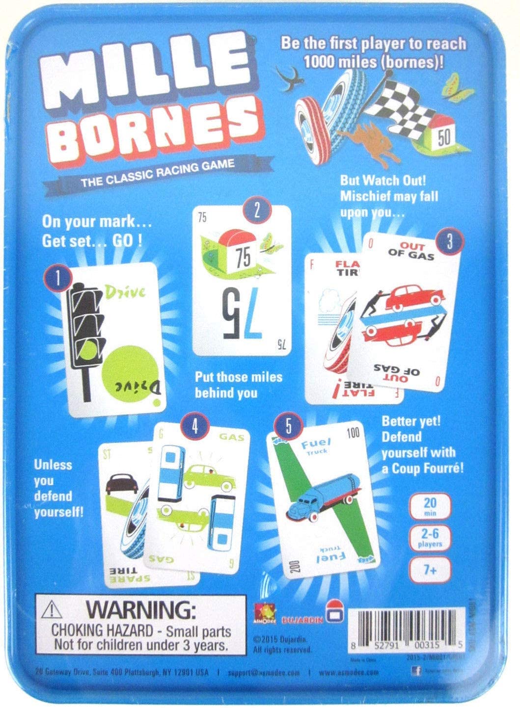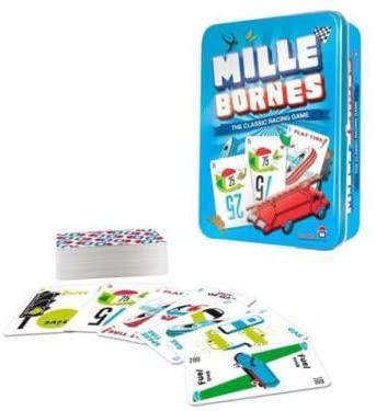 One Thousand Milestones. On French roads there were small marker stones giving the distance in kilometres to the next town. In this famous old French card game, players compete to drive 1000 km, dealing with hazards along the way. Draw a card to your hand, play or discard. You must lay a green traffic light to start, play cards showing mileage, dump hazards (flat tire, speed limit) on the other players, remedy hazards (spare tire, end of limit) from yourself, play safety cards (puncture proof), and try to be the first to clock up the distance.