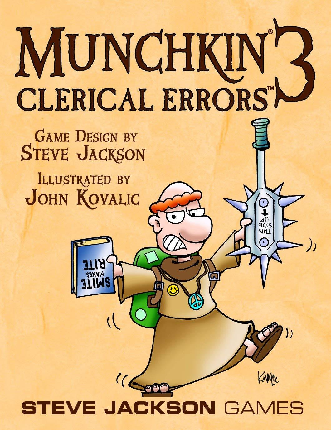 You wanted more Munchkin, so here it is! Created by Steve Jackson and illustrated by John Kovalic... Munchkin 3 - Clerical Errors has 112 more cards for the best-selling game of killing monsters and taking their stuff. Play a new race: Gnomes! Try on the Bard class. Face the Tequila Mockingbird, the Bad Ass, and the dreaded Auntie Paladin! Equip yourself with amazing items like the Chainmail Bikini and the Stab-A-Matic... and show them who's the mightiest, munchkinest dungeon delver of them all.