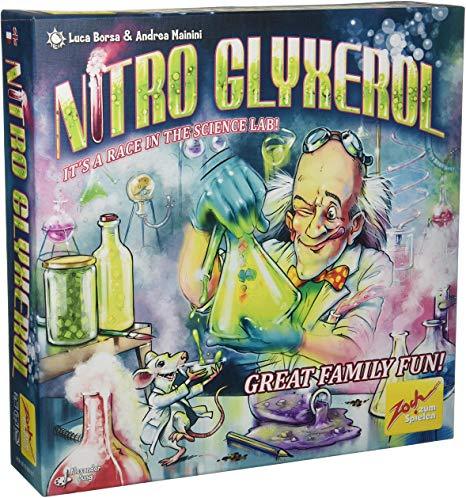 Nitro Glyxerol is an action game that rewards clever timing over raw dexterity. Each player has a laboratory flask (a 3D labyrinth) full of colorful ingredients (colored cubes). Simultaneously, the players start shaking their flasks in order to navigate the ingredients into the flask's spout in the right order. Each player has to decide though when to stop as smaller ingredient chains can be used to pick up victory point cards before the opponents with longer chains may do so.