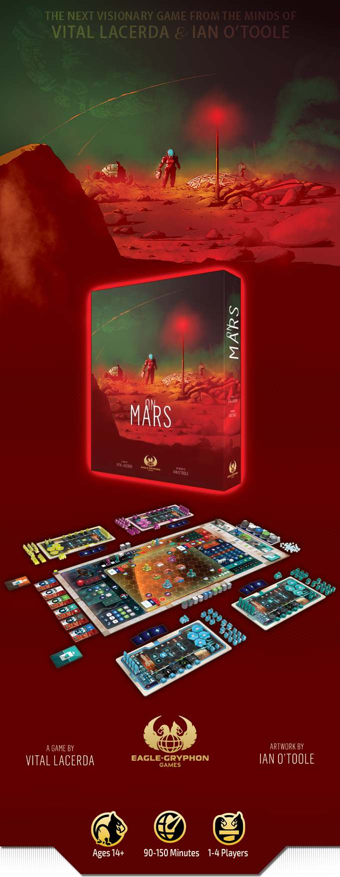 During the game, players are also trying to complete missions. Once a total of three missions have been completed, the game ends. To win the game, players must contribute to the development of the first colony on Mars. This is represented during the game by players gaining Opportunity Points (OP). The player with the most OP at the end of the game is declared the winner.