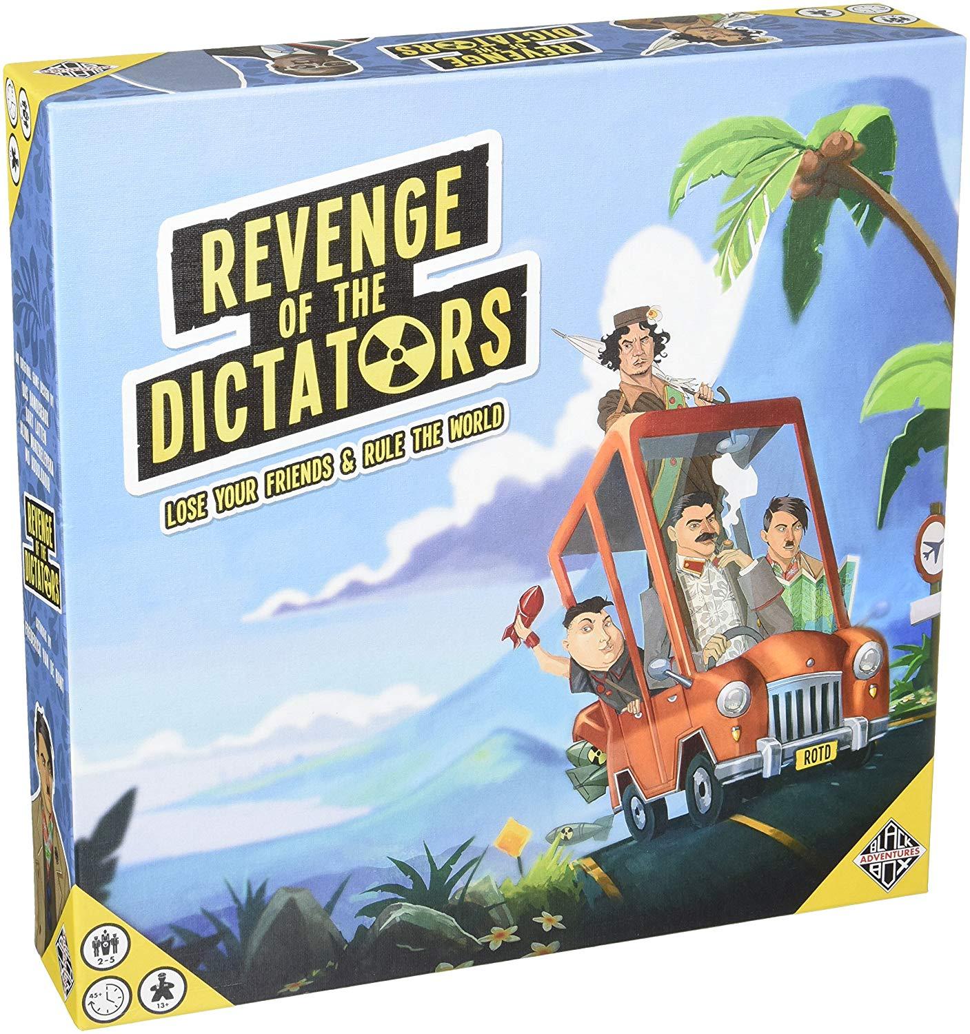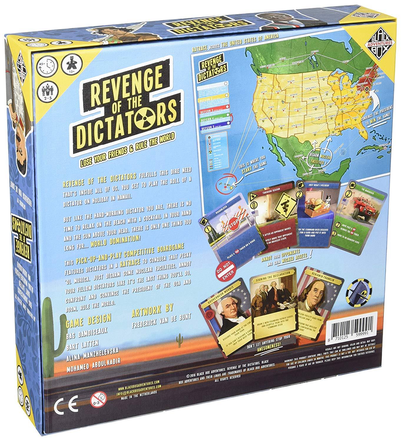 Revenge of the Dictators is a way too competitive board game for 2-5 players. For the course of the game (yes, only during the game) each player becomes a vicious self-loving dictator. The ultimate goal of the game is easy: race across the map of North America, confront the President, take over the USA, and by doing so gain absolute control of America's forces and therefore the world! The only thing the dictators have to do to avoid eminent repercussions is disarm some nuclear facilities in order to remove the nuclear threat targeting their home countries. Sounds simple, right? The only thing is that dictators aren't used to working together — and in the end there can be only one Grandmaster Über Dictator of the world!