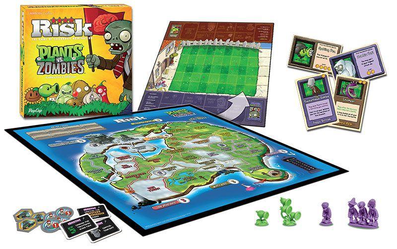 Risk: Plants vs. Zombies is a two-player-only version of the decades-old Risk game, with one player controlling the plants of the wildly successful Plants vs. Zombies digital game and the other controlling the zombies. The game features a double-sided game board and three play modes: mission objectives, tower defense, and total domination.