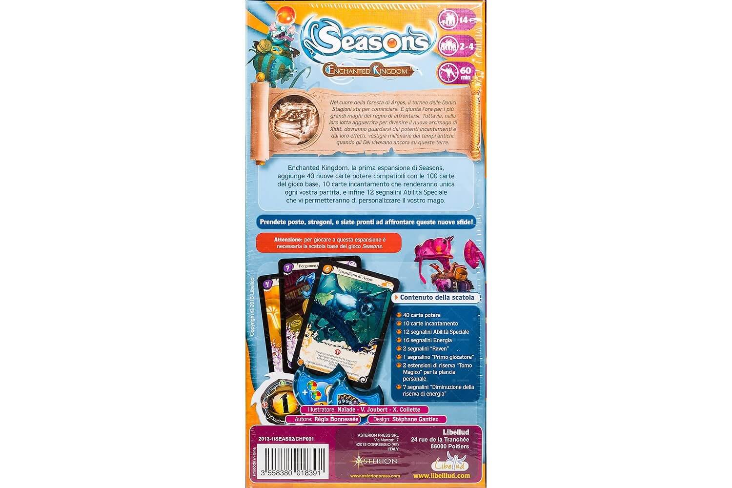 Seasons: Enchanted Kingdom, the first expansion for Seasons, includes two copies each of 20 new power cards, 10 enchantment cards, 12 special ability tokens that fit into the hole on a player board – so that wasn't just kooky graphic design, but rather foreshadowing! – and additional other material, such as two replacement cards that have received errata in newer editions of Seasons.