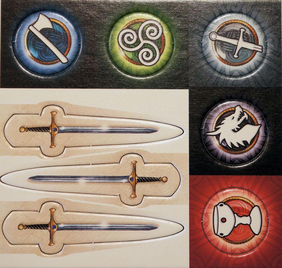 Once three swords have been claimed, whatever the color, a player can choose to accuse another player of being traitorous to the cause, winning a reward if correct and a penalty otherwise. If the players collect seven white swords, they have stopped Morgan's forces and win. If, however, they collect seven black swords first, then Arthur's kingdom falls.