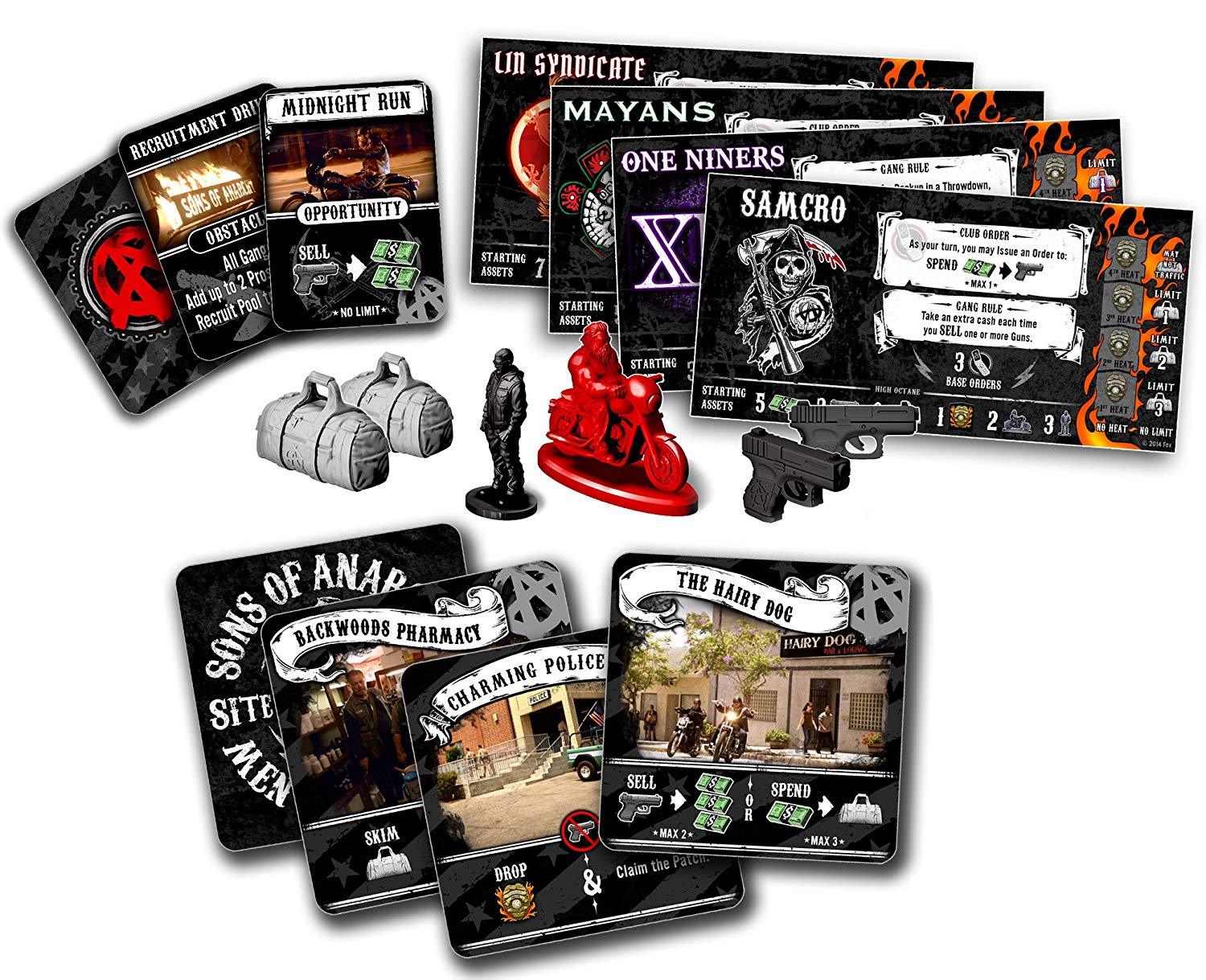 + Due to a packing error many first print copies of the game are missing a reference card, 'The Black Market'. You can find the PDF for this card in the files section of this page. The missing card also comes in both the Sons of Anarchy: Men of Mayhem – Grim Bastards Club Expansion and Sons of Anarchy: Men of Mayhem – Calaveras Club Expansion.