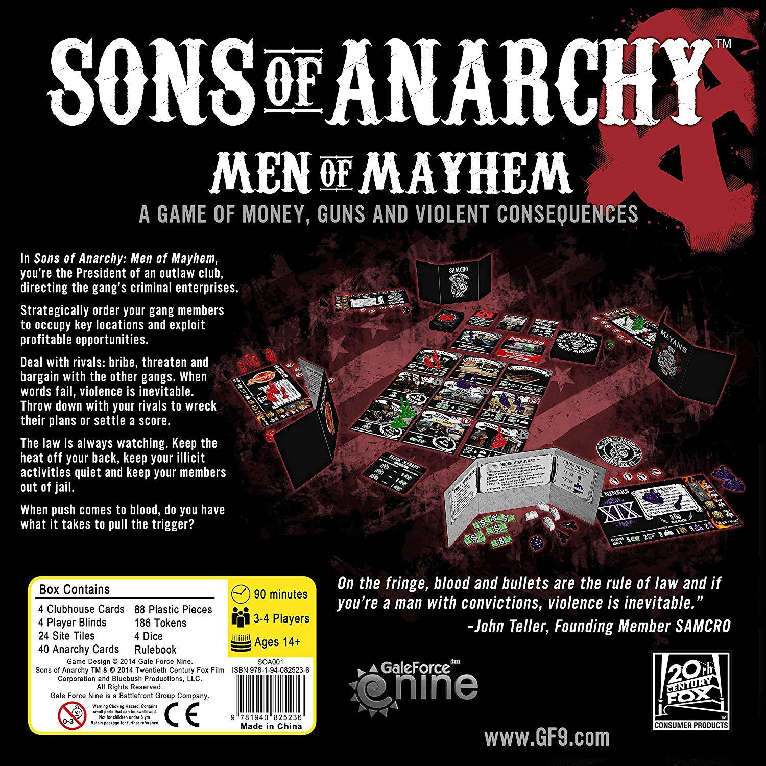 + First print copies of SoA: Men of Mayhem include a promo Clubhouse Card for the 'Grim Bastards' Motorcycle Club, which can be used as a substitute for one of the other playable gangs. This promo is also now available as part of a full 5th player expansion in the Sons of Anarchy: Men of Mayhem – Grim Bastards Club Expansion.