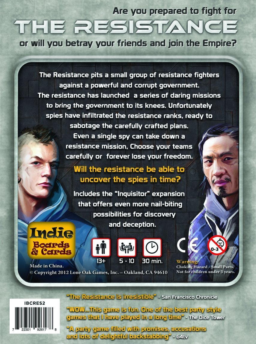 The Resistance is a party game of social deduction. It is designed for five to ten players, lasts about 30 minutes, and has no player elimination. The Resistance is inspired by Mafia/Werewolf, yet it is unique in its core mechanics which increase the resources for informed decisions, intensify player interaction, and eliminate player elimination.