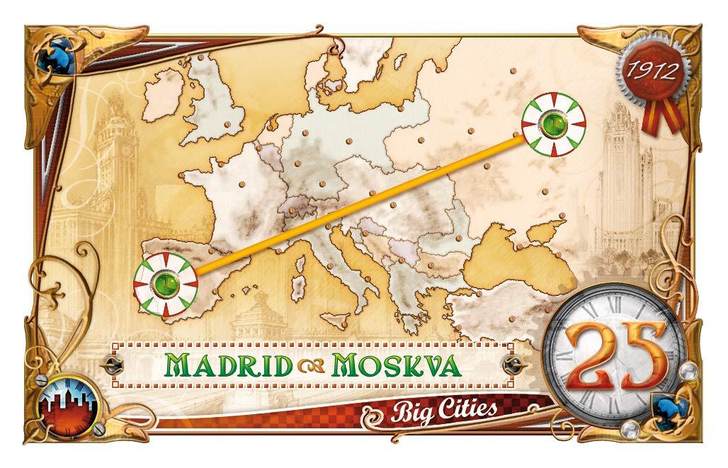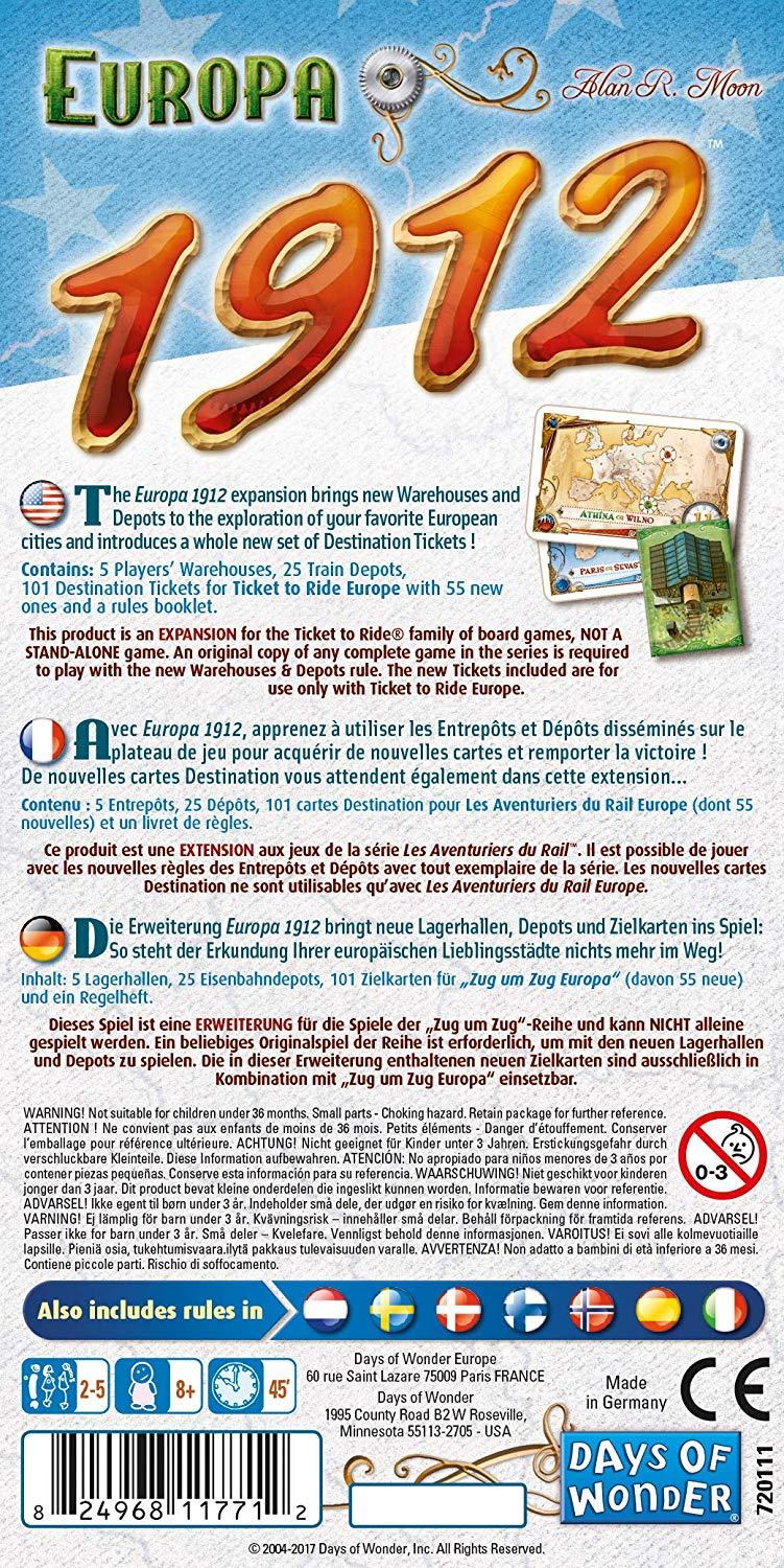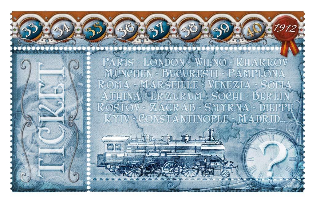 The Ticket to Ride Europa 1912 expansion for the Ticket to Ride series includes 101 Destination Tickets - the 46 original tickets, plus 55 new ones that enable 3 new variants to the Ticket to Ride Europe map: Europe Expanded, which adds 19 new routes to the original 46; Big Cities of Europe, with tickets to 9 major European cities; and Mega Europe, which uses all the new routes as well as the 46 original Destination Tickets.