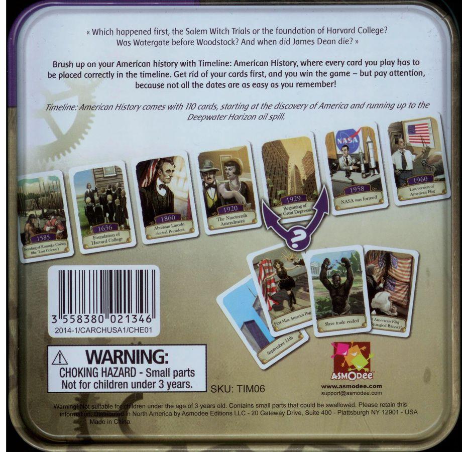 In Timeline: American History, players have hands of cards and take turns attempting to place the cards correctly into the growing timeline. Easy at first, but rapidly growing more difficult, Timeline: American History tests your knowledge and helps you learn the history of the nation.