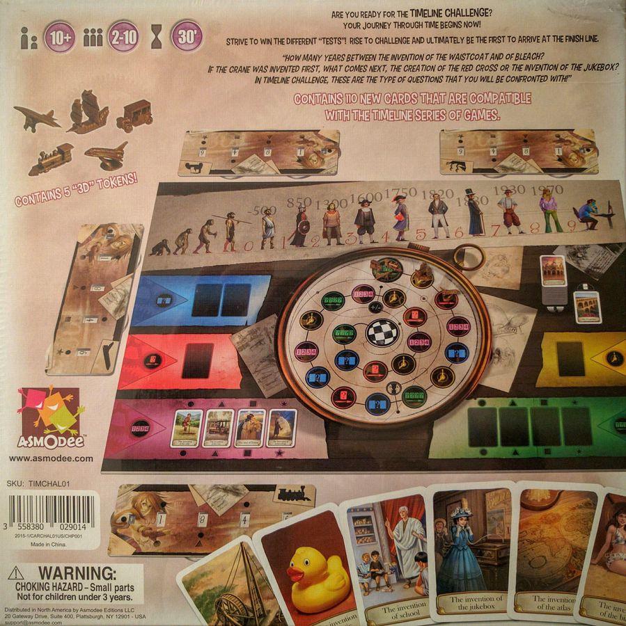Timeline Challenge incorporates the original mechanic of the series into progressive game track, of which players can move between 0-4 spaces per turn. Players will have to make use of pre-determined time periods and guess where the incident depicted on the card occurred. There are four different challenges, and they are played depending on the color of the game space of the lead player. Additionally there are two further challenges which allow the two players at the back of the pack to catch up. Although the game comes with its own cards, it can be integrated with any or all of the previous sets.