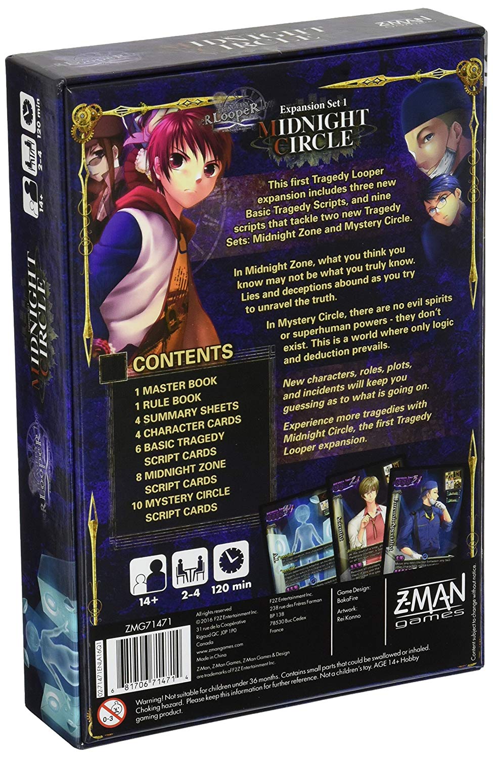 Tragedy Looper: Midnight Circle is an expansion for the international version of Tragedy Looper and includes some of the material previously released in the Japanese booklet expansions Midnight Zone and Mystery Circle. It also includes four all-new characters: Forensic, Illusion, A.I. and Scientist.