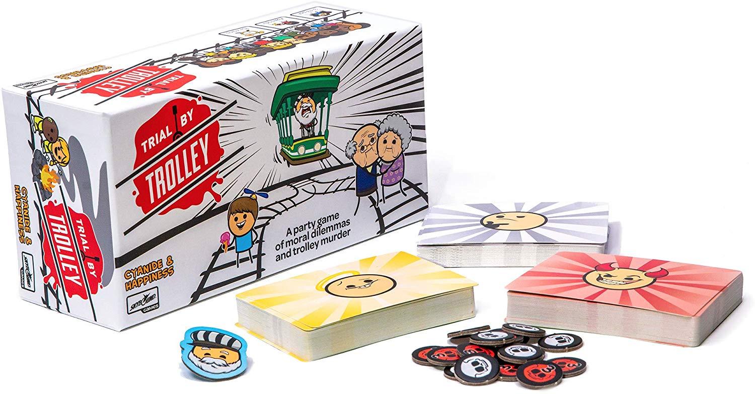 In Trial by Trolley, one player acts as the Trolley Operator and must choose where to send a murderous, out of control, trolley. Every other player at the table plays cards and argues in order to convince the operator to spare their lives and condemn everyone on the other track to a gruesome death-by-trolley.