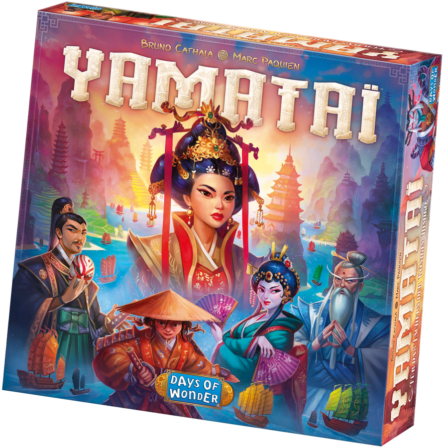In Yamatai, 2-4 players compete to build palaces, torii, and their own buildings in the land of Yamatai. The game includes ten numbered action tiles, each showing one or more colored ships and with most showing a special action. You shuffle these tiles, place them in a row, then reveal one more than the number of players.