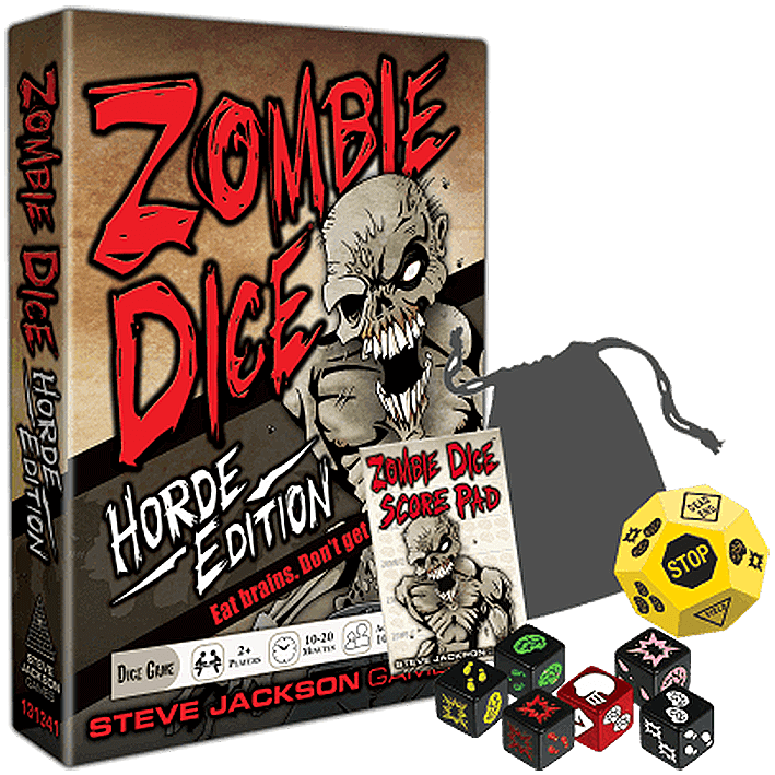 Zombie Dice Horde Edition includes the Zombie Dice base game, as well as the Zombie Dice 2: Double Feature and Zombie Dice 3: School Bus expansions, along with a cloth bag and a scorepad to keep track of those tasty brains.