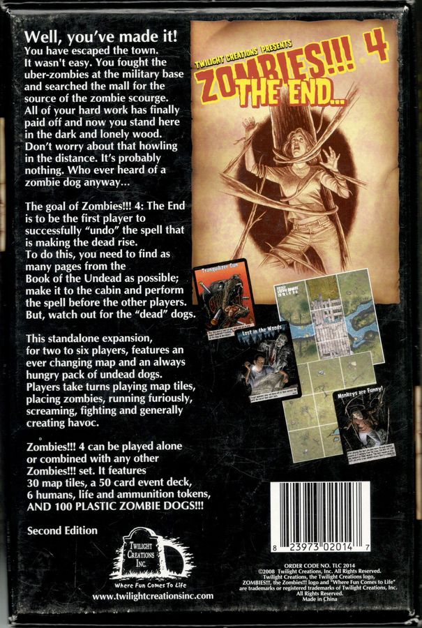 This standalone expansion, for two to six players, features an ever changing map and an always hungry pack of undead dogs. Players take turns playing map tiles, placing zombies, running furiously, screaming, fighting and generally creating havoc. Zombies!!! 4 can be played alone or combined with any other Zombies!!!set(s).