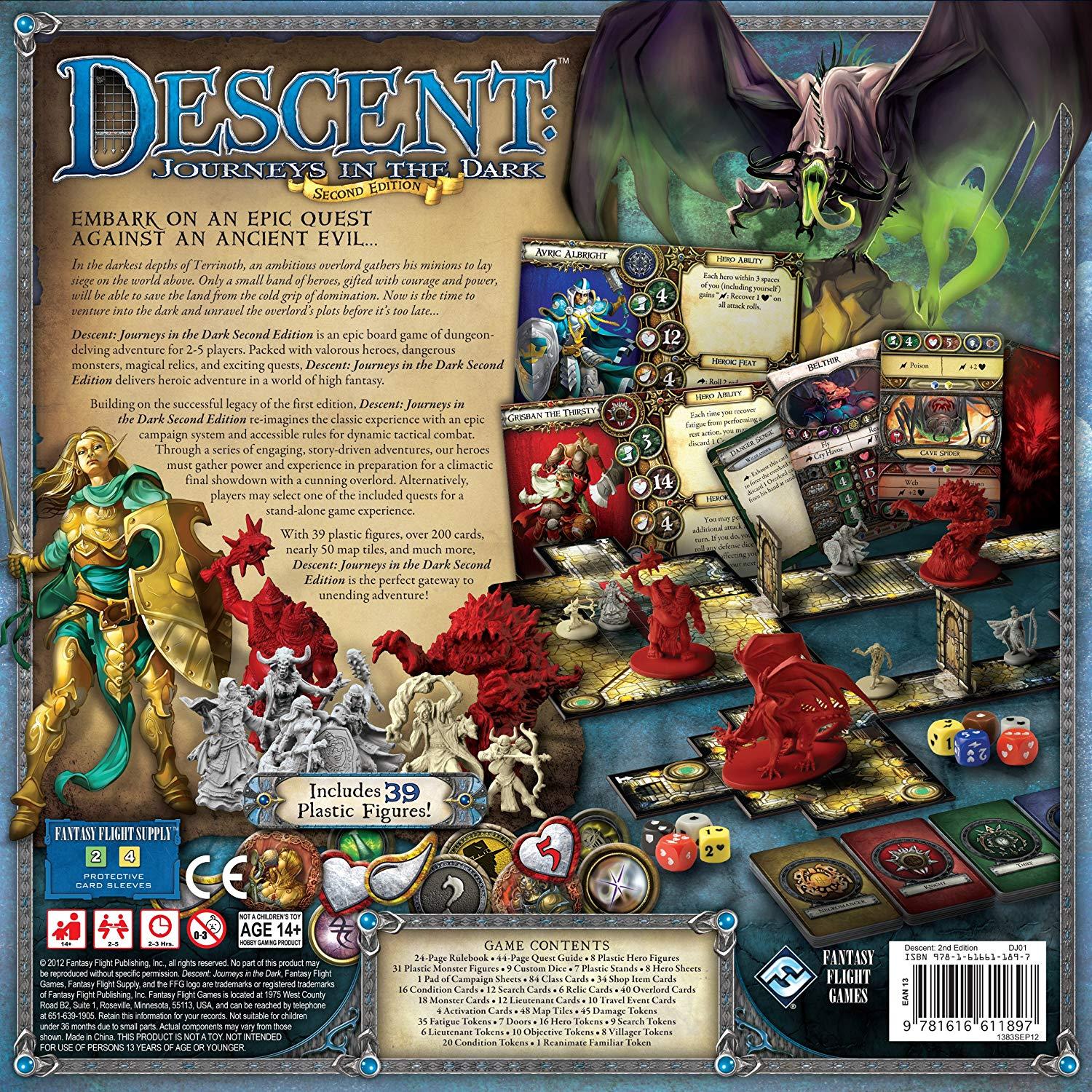 Descent: Journeys in the Dark (Second Edition) is a board game in which one player takes on the role of the treacherous overlord, and up to four other players take on the roles of courageous heroes. During each game, the heroes embark on quests and venture into dangerous caves, ancient ruins, dark dungeons, and cursed forests to battle monsters, earn riches, and attempt to stop the overlord from carrying out his vile plot.